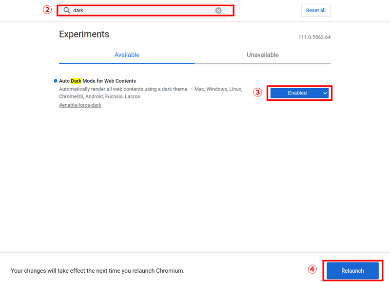 2. Experimentsの画面が表示されたら、上部の検索(Serch flags)に「dark」と入力