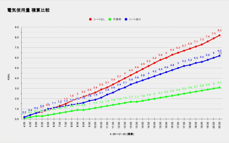 赤はシートなし。 青がシートあり。 緑はエアコンを使わなかった時の状態です。