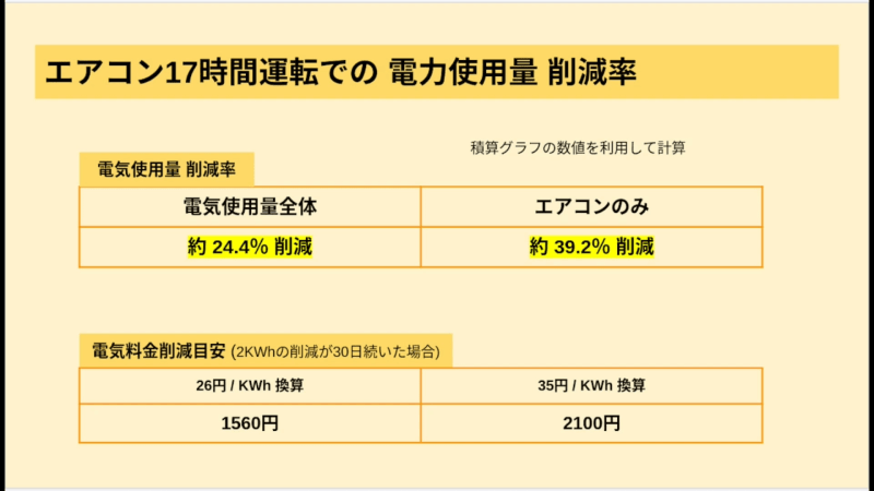 エアコン単体でみると、約 39.2% の電力使用量が削減できたことが確認できました。