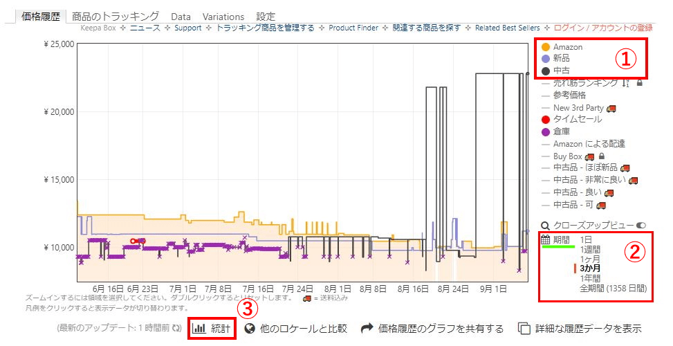 - グラフ下の統計にカーソルを合わせると 表示期間内の「 ”Amazon、新品、中古” それぞれの”最低、最高、平均価格”を簡易表で確認できる」