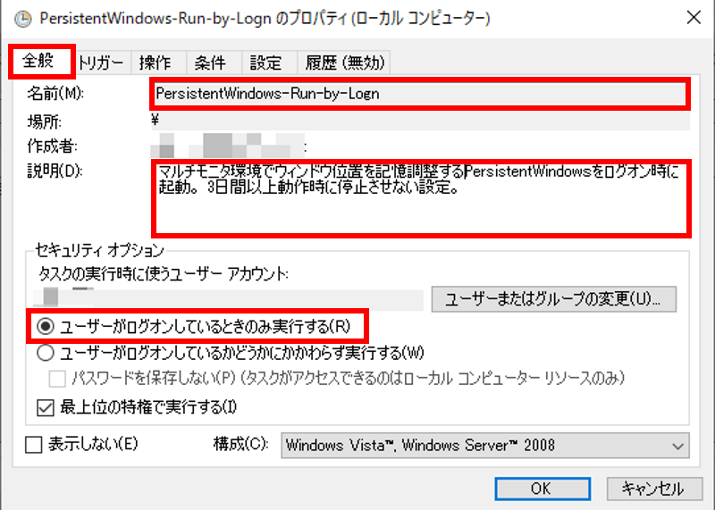 後で自分が見てわかるように今回は 「PersitentWindows-Run-by-Logon」としました。
