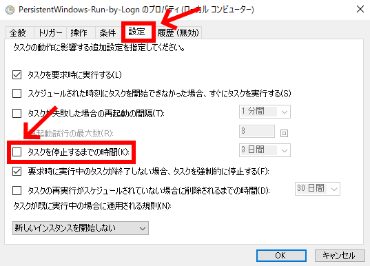 「タスクを停止するまでの時間」の チェック ✔ を外します