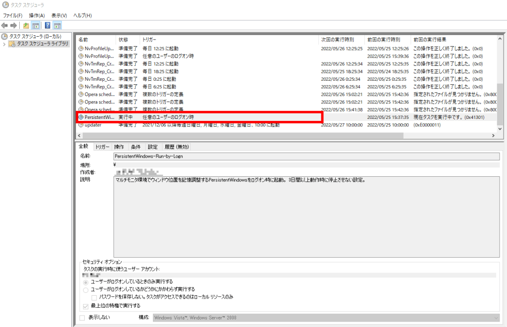 ウィンドウズを起動させるたびに exeファイル を ダブルクリックして「PersistentWindows」を起動させるのは面倒なので、スタートアップの項目として加えても良いと思うのですが、ツール作者が「タスクスケジューラ」から「ユーザーログオン時」に「PersistentWindowsが起動する」タスクの作成を推奨しています。(Githubページの下の方に記述を確認できると思います)