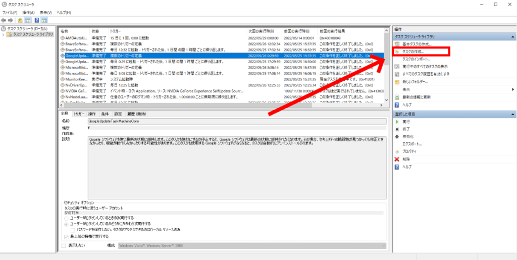 タスクスケジューラ の リスト欄に新規作成した項目が追加されていることを確認します。