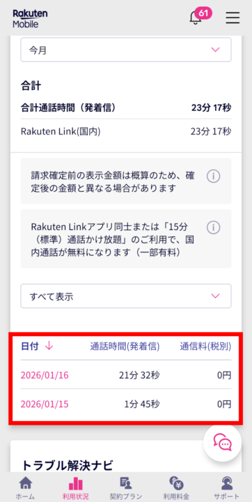 乗っ取られていた期間内の楽天LINK経由の通話について、my楽天モバイルアプリを確認してLINKの無料通話機能が有効で通話料金が無料だったことが確認できた。