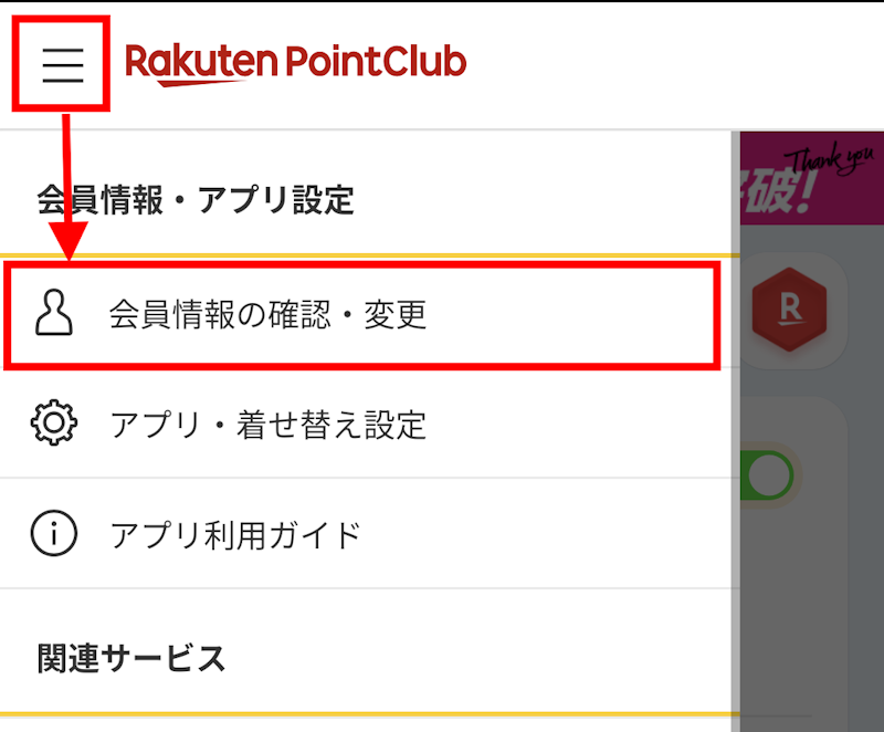 画面左からメニューが表示されたら「会員情報の確認・変更」をタップ