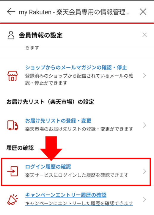 会員情報の設定画面から「ログイン履歴の確認」をタップ