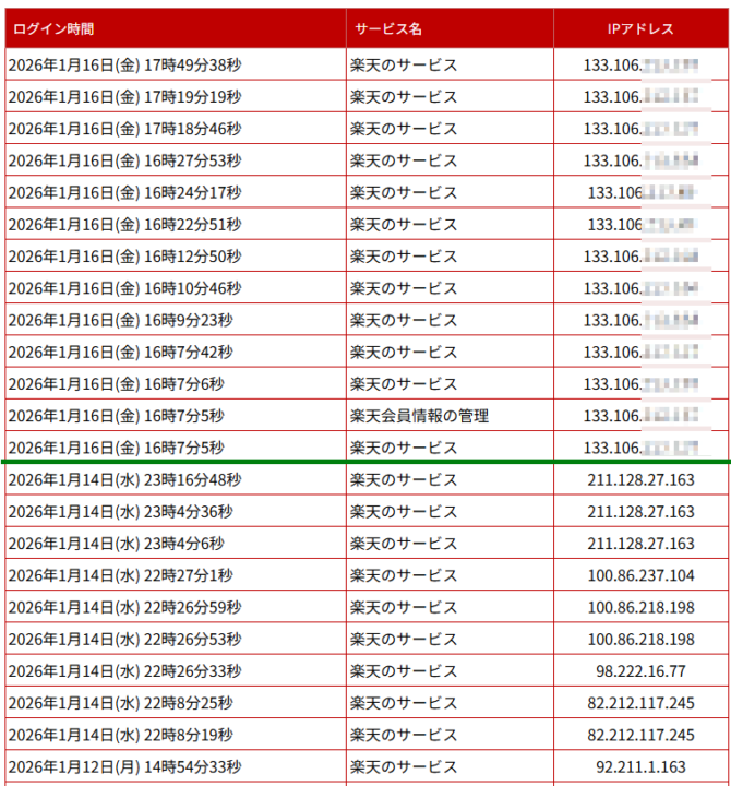 後日(2026-01-19)、ログイン履歴を再確認するためにモバイルアプリやPCブラウザーからmy Rakutenにアクセスした時にログイン操作が必要となったが、ワンタイムパスの操作は発生しなかった。