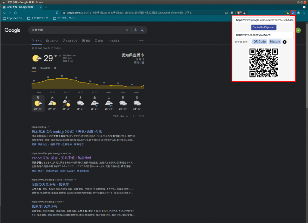 そうすると下の図のようにミニウィンドウで短縮URLが表示されます。