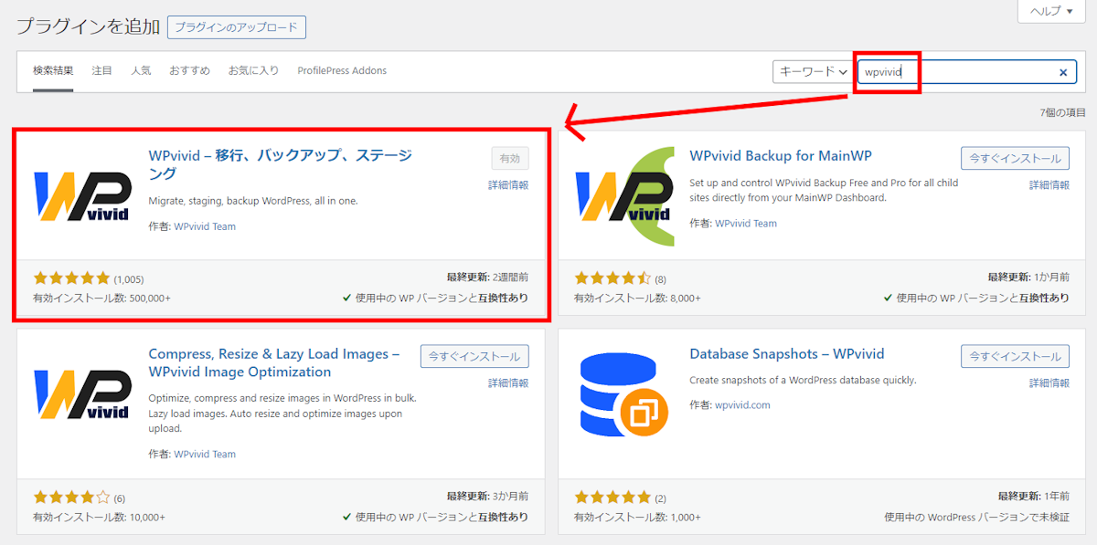 右上の検索欄でwpvividを検索するとWPvividに関連するプラグインがいくつか表示されますが、今回導入するのは「WPvivid – 移行、バックアップ、ステージング」というプラグインです。 一つ目に表示されると思うので迷うことはないと思いますが、画像も貼っておきます。