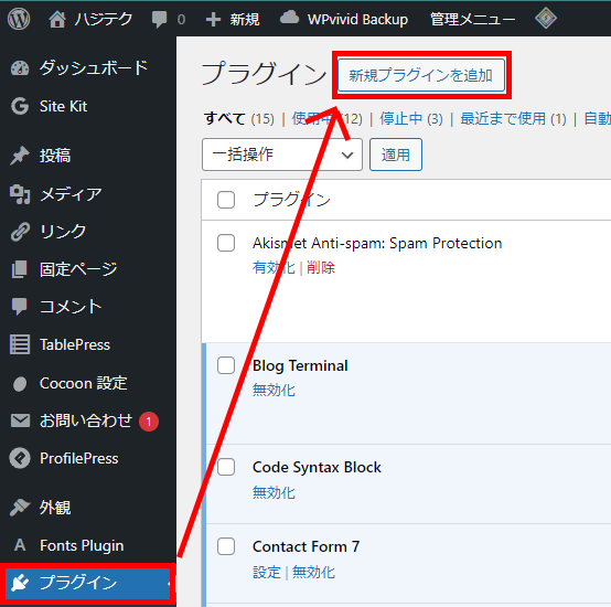 WordPressの管理画面から プラグイン>新規プラグインを追加 を選択