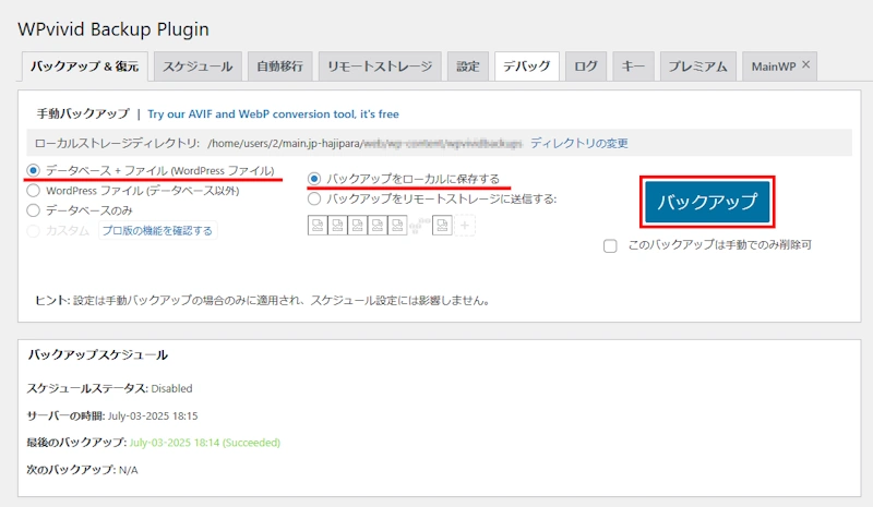 今回は手動バックアップ以外は試していませんが、スケジュールを設定して定期的なバックアップをすることもできます。