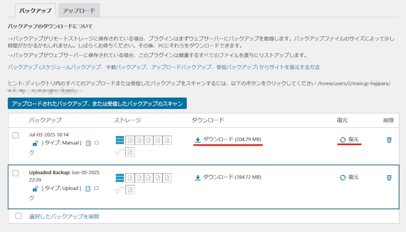 今回は2つ表示されていますが、上側が今回作成したバックアップで下側は以前別のサーバーで取得したファイルをアップロードしたものです。